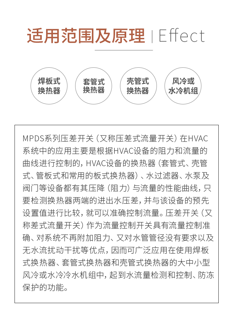 MPDS6系列壓差開關(又稱壓差式流量開關)在HVAC系統中的應用主要是根據HVAC設備的阻力和流量的曲線進行控制的,我們知道HVAC設備的換熱器(套管式、殼管式、管闆式和常用的闆式換熱器)、水過濾器、水泵及閥門等設備都有其壓降(阻力)與流量的性能曲線,隻要檢測換熱器兩端的進出水壓差,并與該設備的預先設置值進行比較,就可以準确控制流量。壓差開關(又稱差式流量開關)作爲流量控制開關具有流量控制準确、對系統不再附加阻力、又對水管管徑沒有要求以及無水流擾動幹擾等優點,因而可廣泛應用在使用焊闆式換熱器、套管式換熱器和殼管式換熱器的大中小型風冷或水冷冷水機組中,起到水流量檢測和控制、防凍保護的功能。