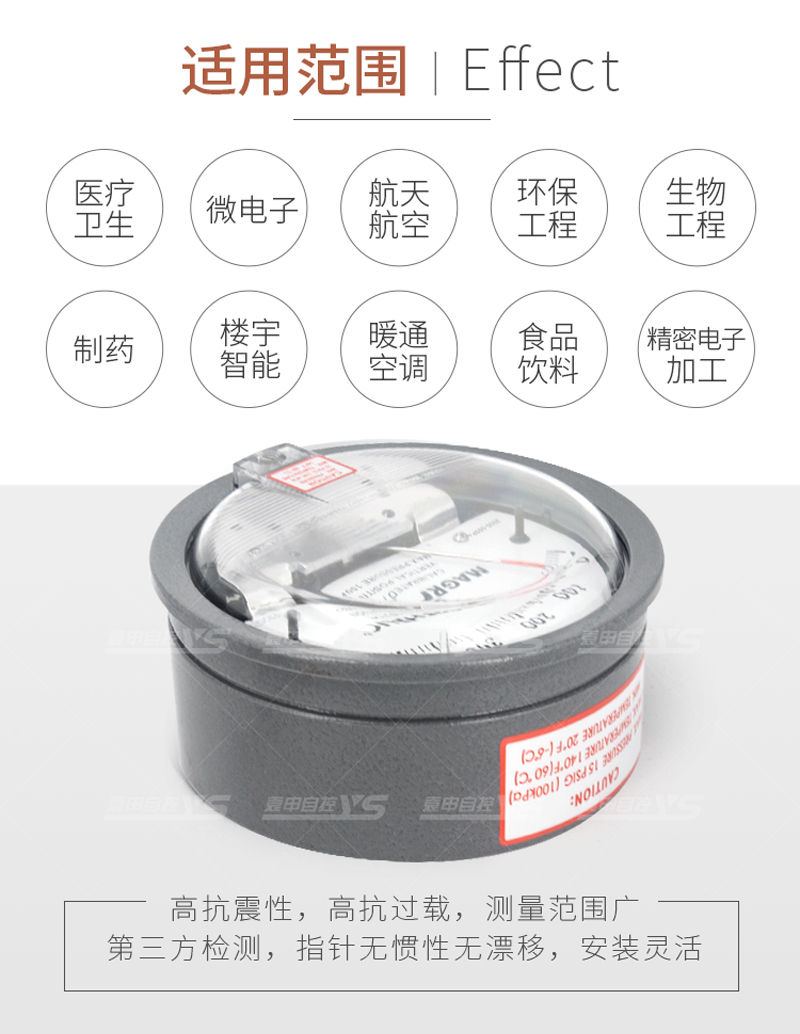 差壓表廣泛應用于工業除塵器、塗裝、藥廠GMP認證、電子廠潔淨室潔淨廠房、暖通空調,淨化空調,電子、醫療、樓宇、食品、空壓機、空調送風機組差壓、潔淨空調過濾網壓差的檢測、過濾器阻力、風機風扇壓力、潔淨操作台、噴塗等領域。
