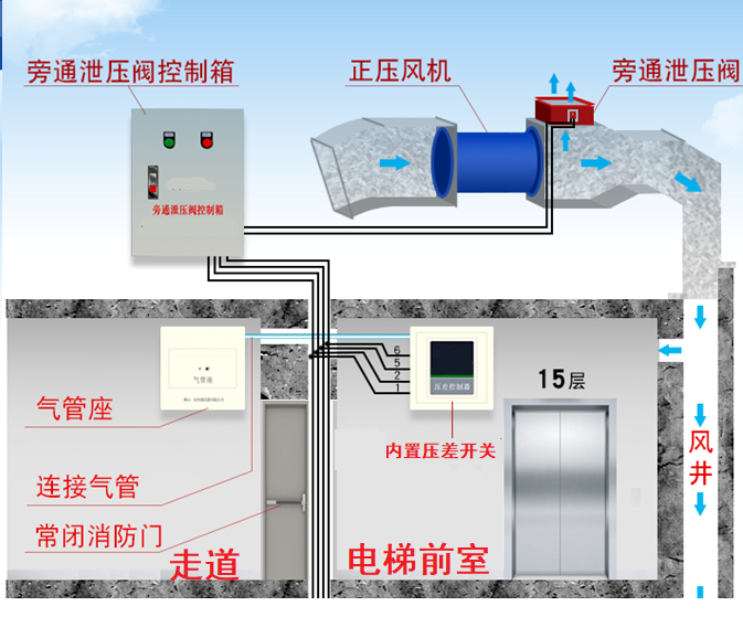 2、控制風量保持前室/ 走道壓差 當前室與走道壓差到達指定30Pa時,前室壓差控制器發出指令到達旁通閥控制箱打開旁通閥,排出部分風量,減少前室風量供給。降低前室風壓。當前室走道壓差降至25Pa時,前室壓差控制器發出指令關閉旁通閥,增加進風量,提高前室風壓,如此循環将前室與走道壓差控制在消防标準的25- 30Pa。